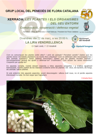 En aquesta xerrada, que tindrà lloc a la Lira Vendrellenca (C/. Sant Jordi, 7. El Vendrell), el divendres dia 22 de març a les 20:00 h, s’anirà donant resposta a totes aquestes preguntes i a d’altres igualment interessants, mentre parlem de les relacions existents entre les plantes i els virus, els bacteris, els fongs, els animals i altres plantes. La xerrada és a càrrec de Francesc Caralt Rafecas (president de Flora Catalana).